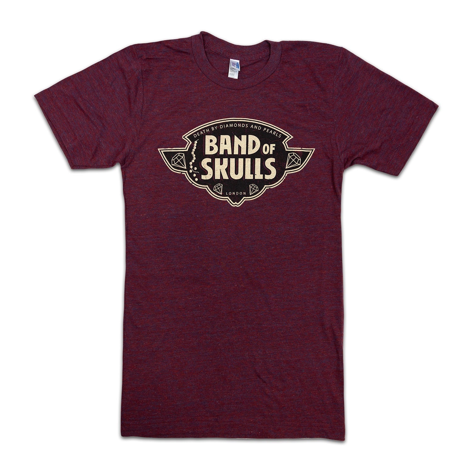 100% cotton red heather t-shirt featuring a large 'Band of Skulls - Death by Diamonds and Pearls' front print.