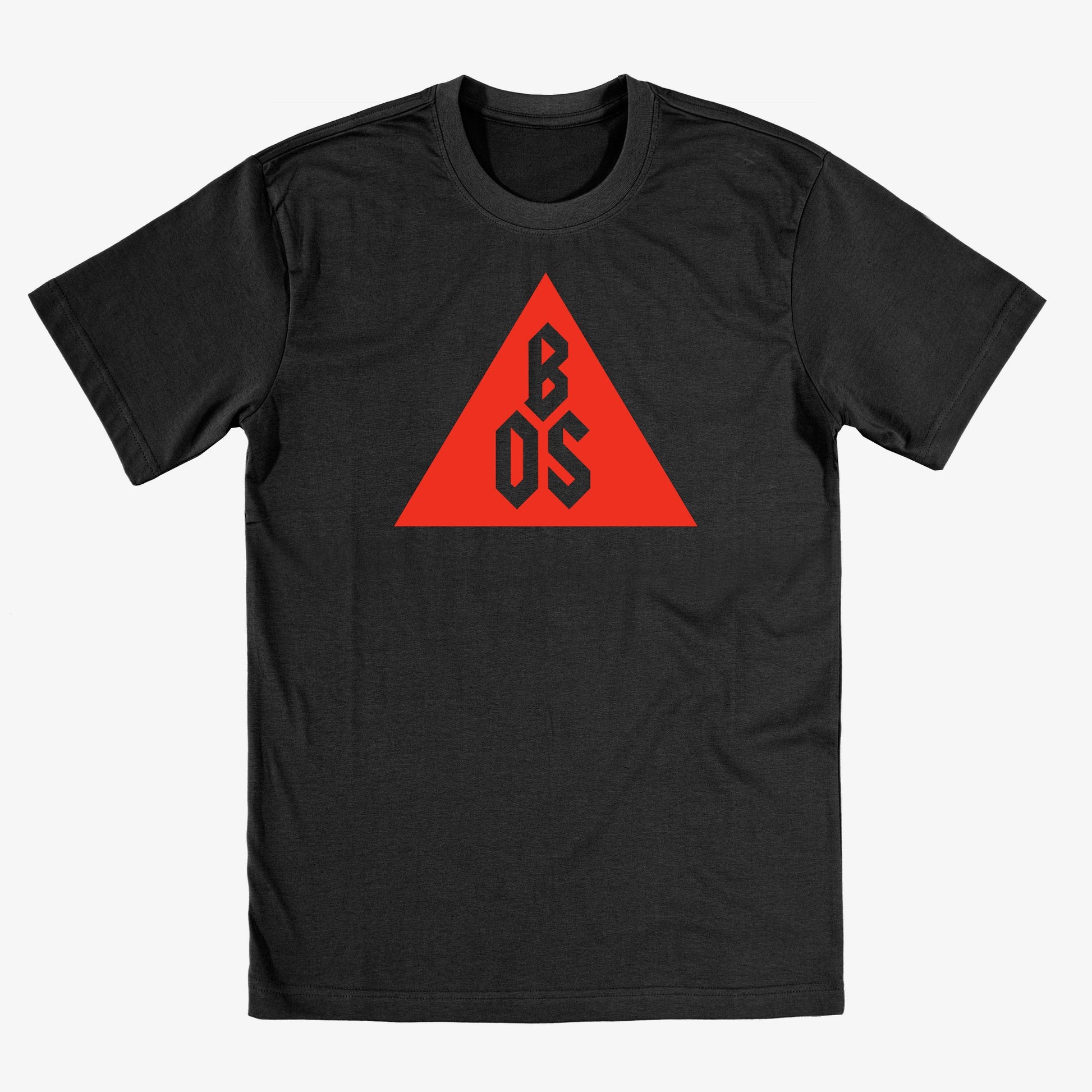 100% cotton black t-shirt featuring a 'BOS' triangle logo front print.
